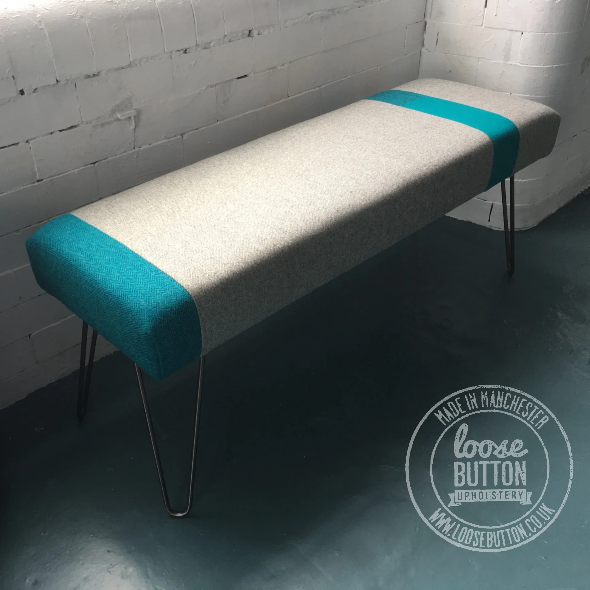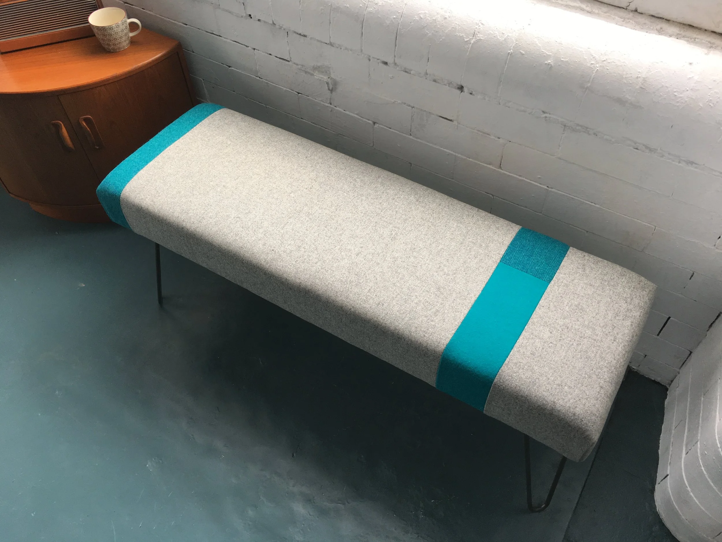 Created and designed in house, the new colour block bench uses contrasting fabrics for bold colour definition alongside different textures such as Herringbone & Melton Wools from Abraham Moon & Sons with a Herringbone Harris Tweed. Here we used raw steel hairpin legs that fits the contemporary and urban design which is built upon a wooden frame, topped with foam layers for a firm yet comfortable seat.