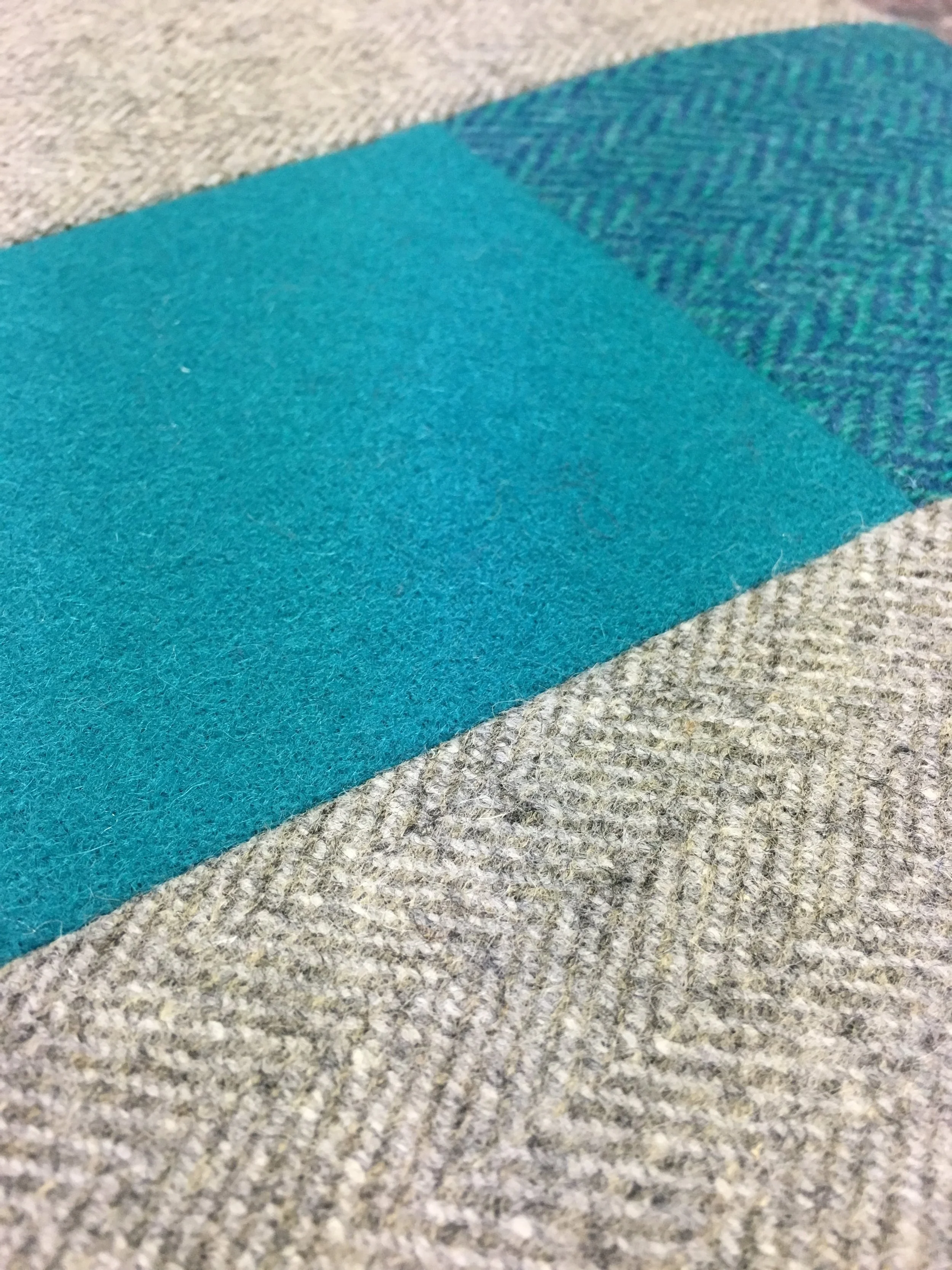 Pictured is a Gull grey Herringbone fabric from Abraham Moon & Sons with accent colours from Harris Tweed and Melton Wools.