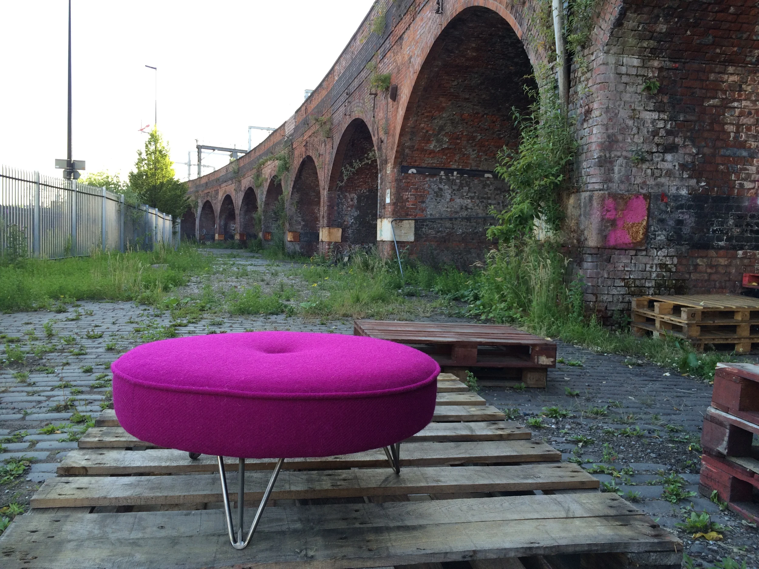 This small hairpin leg footstool features 8" raw steel 2-prong hairpin legs giving it a mid-century modern feel with an urban twist. Upholstered with top quality on-trend fabrics and given a piping edge detail. This smaller version is 18" across and has a comfy foam layer allowing it to be used also an occasional stool. Finished with a single central button and the standard 'loose button' branding underneath.